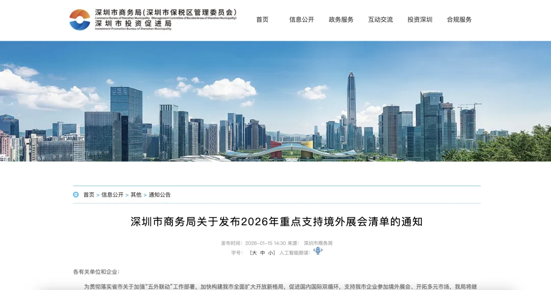 政策全称与渊源:其正式名称通常为《深圳市关于2026年度境外展览重点支持项目计划》。该政策的制定延续了自2023年以来深圳加大对中小企业出海扶持力度的连贯性,并与广东省“五外联动”及“粤贸全球”品牌工程形成上下协同。例如,2025年的清单制定便明确参考了《广东省商务厅关于2025年“粤贸全球”广东境外商品展览平台计划的公告》中的重点展会。