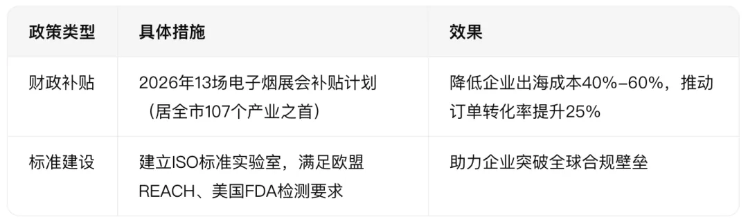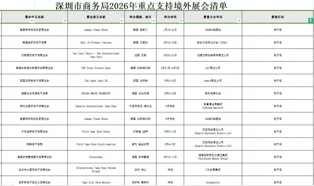 - 深圳将电子烟列为战略性新兴产业,通过展会补贴、税收优惠等政策降低企业出海成本(如2026年13场电子烟及CBD展会补贴计划居全市107个产业之首)。