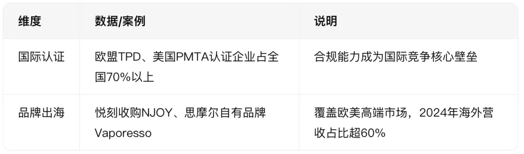 - 思摩尔(Vaporesso)、卓力能(ALD)等企业通过自有品牌进军欧美高端市场,悦刻、魔笛等品牌通过欧盟TPD、美国PMTA等法规认证,建立本地化仓储与售后。
