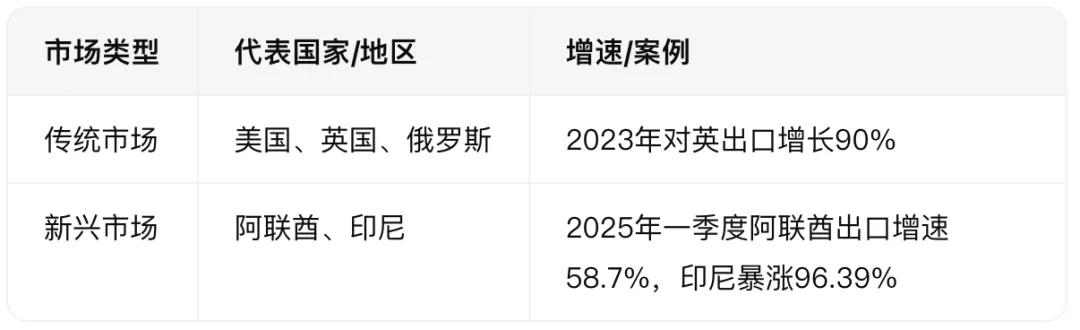 - 传统市场:美国仍为最大出口国(2024年占中国出口额超1/3),但欧盟、英国、俄罗斯等市场增速显著(2023年对英出口增长90%)。