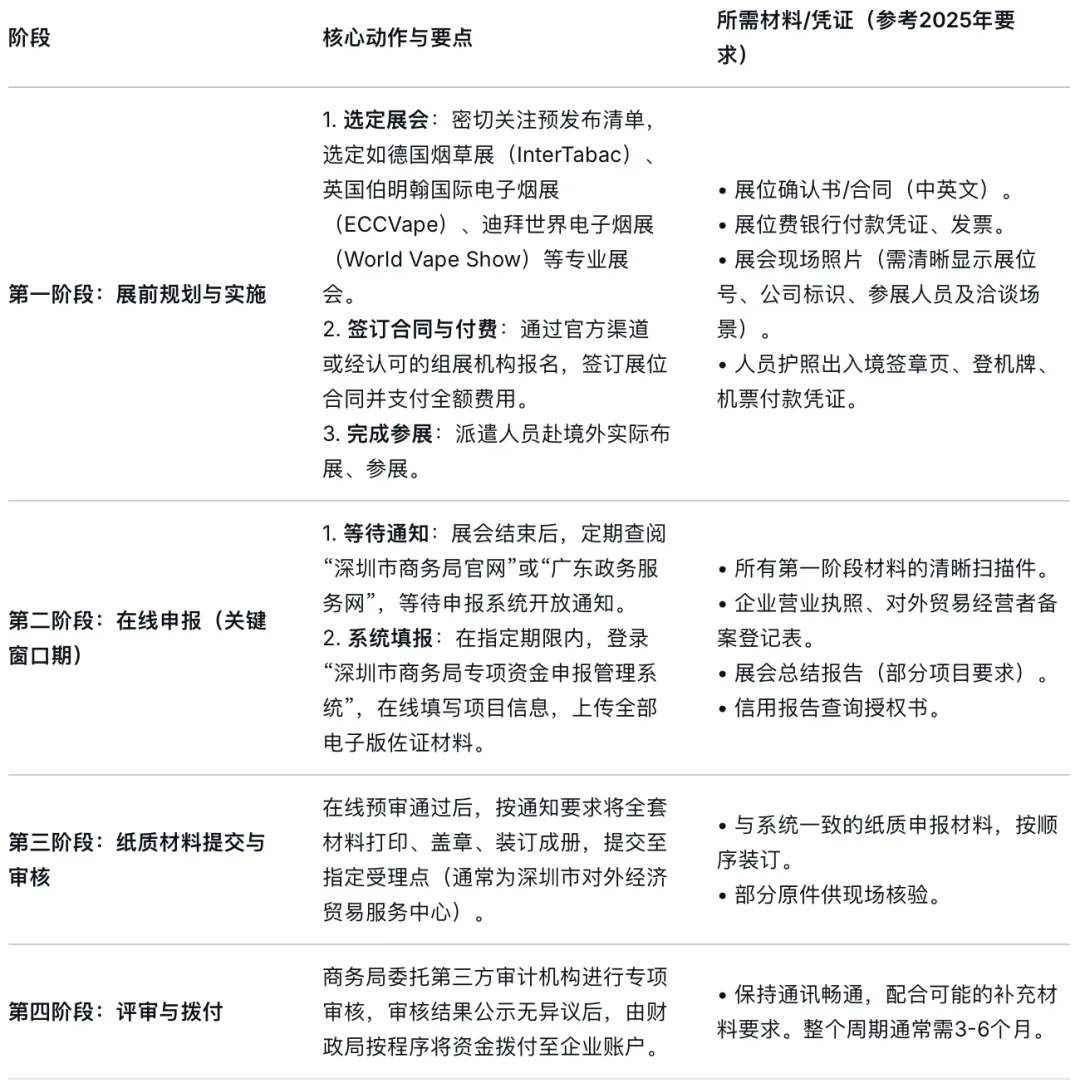 政策性质与目标:这是一项市级财政专项资金,采用“事后补助、据实拨付”的原则。其核心目标并非普惠,而是引导性支持:旨在引导深圳优势产业(包括消费电子及其延伸的电子雾化板块)的企业,参加在国际目标市场中具有权威性、专业性和实效性的展览会,从而提升“深圳制造”与“深圳品牌”的国际市场份额。