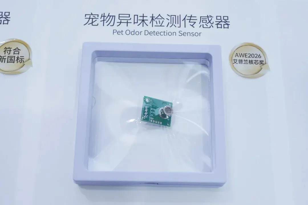 宠物异味检测传感器,专为宠物环境设计。其可检测硫化氢、氨气、酒精、香烟烟雾、甲醛、苯、一氧化碳、氢气、香精等多种异味气体,分辨率可达0.05ppm,精准性、稳定性、一致性、可靠性等性能行业领先,获得了被誉为“全球智慧生活领域奥斯卡”的AWE2026艾普兰核芯奖,适用于智能猫砂盆、智能宠物屋舍、宠物除臭消毒器、空气净化器、空气质量监测仪等智能设备。