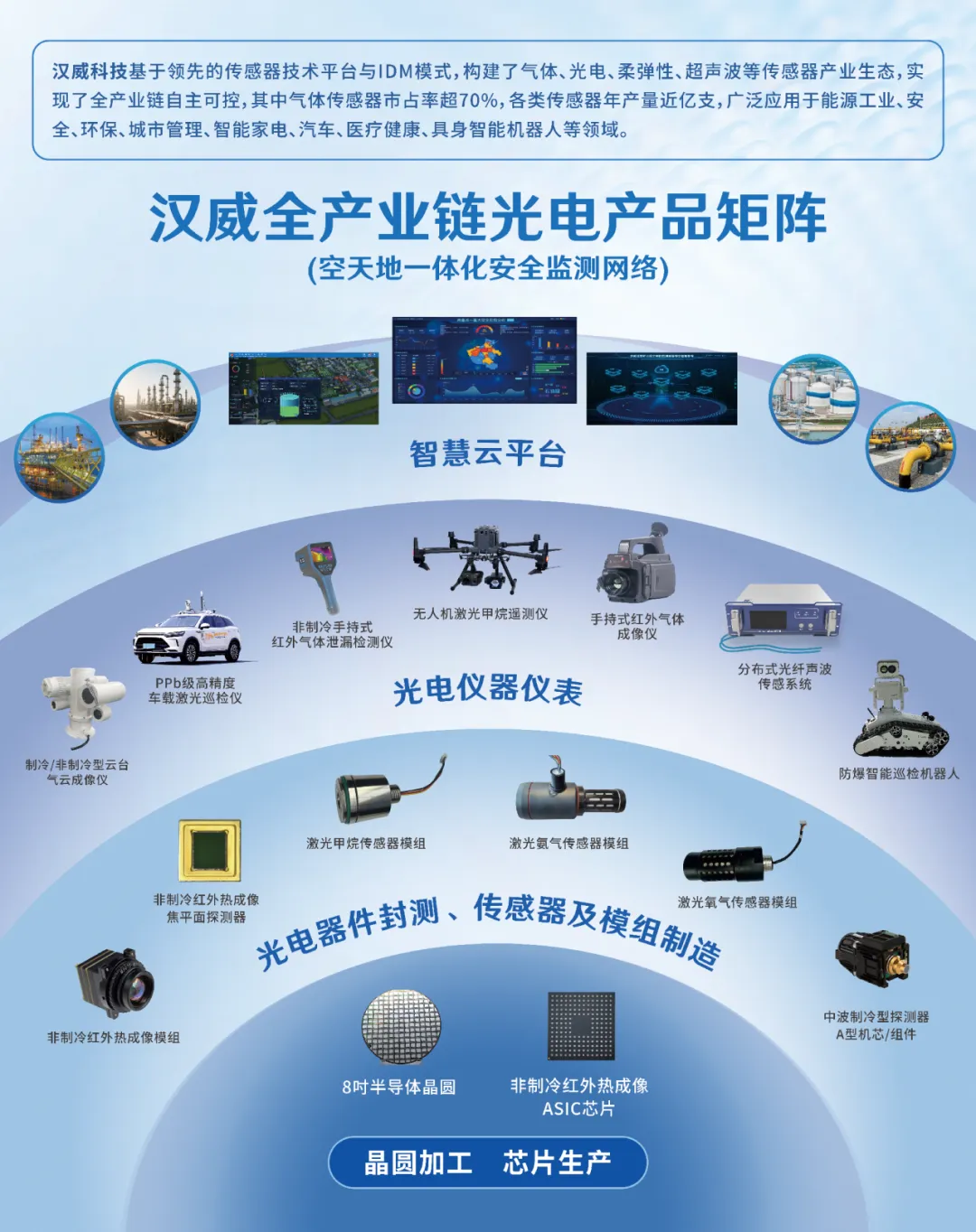 汉威科技集团基于IDM模式打造了完善的光电传感产业生态,针对市场前沿需求,创新研发出多款高性能新产品,实现了从晶圆芯片、激光器、传感器、仪表整机的全链条自主可控。