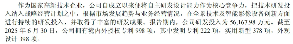 截至2025年中,影石累计授权专利998项,其中发明专利222项,其余多为实用新型和外观设计专利,包括全景拼接、FlowState电子防抖、AI后期等软件算法领域。