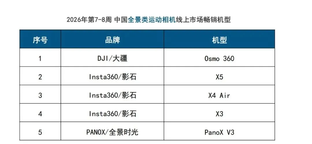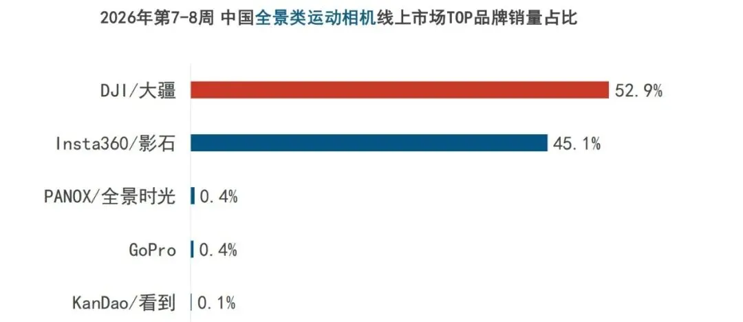 据久谦中台数据,2025年第三季度,大疆从零突破至全球43%的份额,影石则骤降至49%。洛图科技2026年春节周度追踪显示,大疆以62.9%的总销量份额全面压制,影石以28.6%退守。在全景相机细分市场,大疆一款单品就斩获52.9%的份额,影石三款机型合计45.1%。