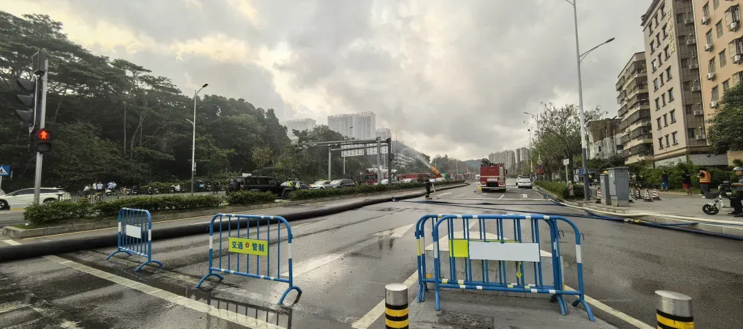 今天上午8时45分,记者赶到坪山区马峦北路附近,看到明火已经扑灭,仍有少量浓烟。现场设置了警戒线,消防,水务等多部门工作人员在现场,进行喷水作业,为保证救援,马峦北路临时封闭。