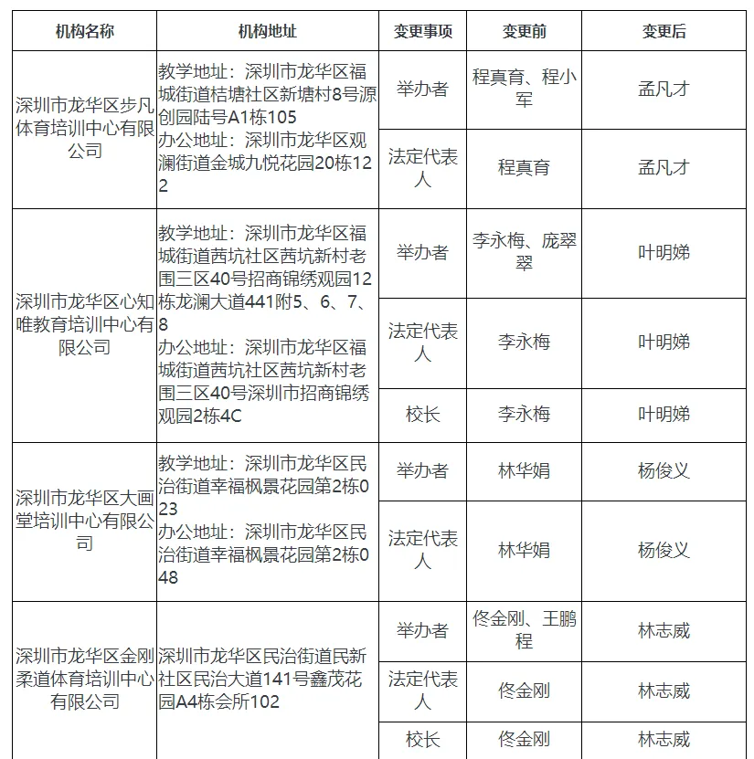 深圳市龙华区教育局关于拟同意深圳市龙华区步凡体育培训中心有限公司等四家培训机构变更举办者、法定代表人和校长的公示