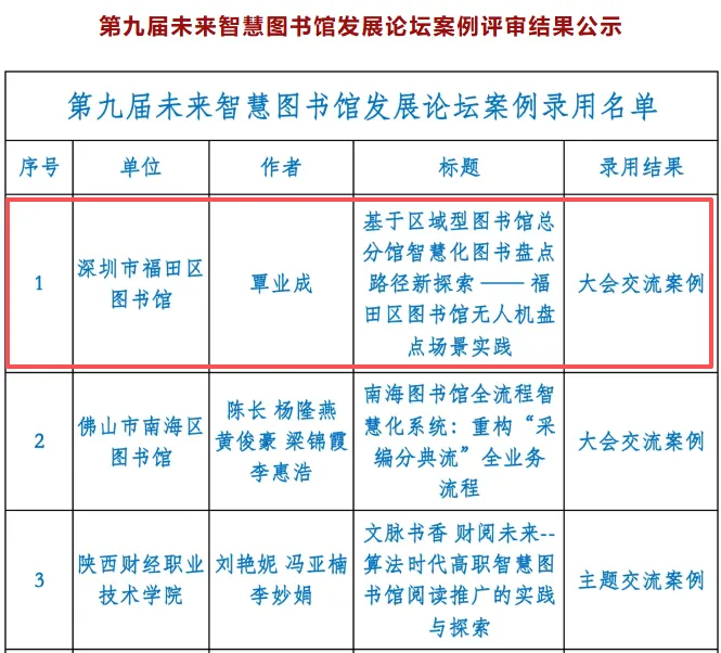 福田区图书馆“基于区域型图书馆总分馆智慧化图书盘点路径新探索——无人机盘点场景实践”,成功入选为“大会交流案例”(类同一等奖)。