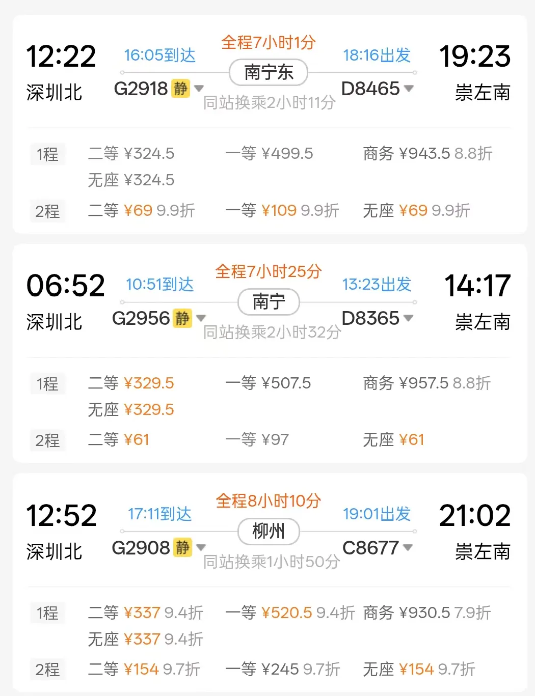 🚇深圳⇋崇左高铁:深圳到南宁然后转到崇左