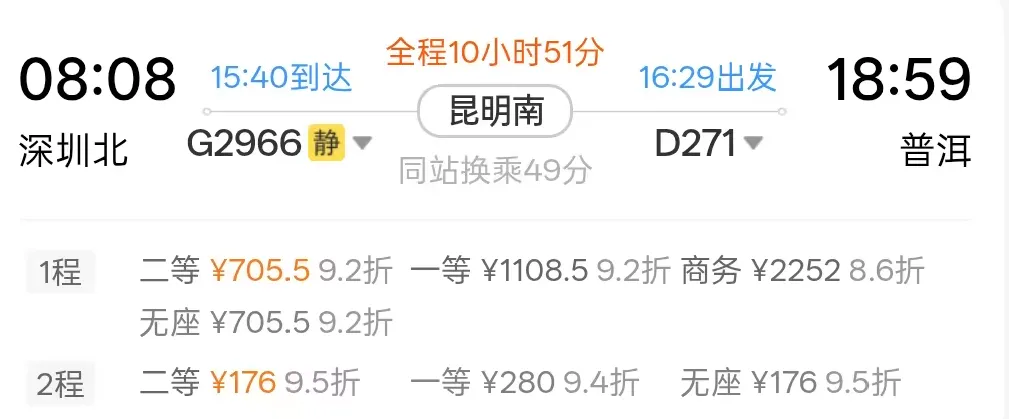 🚇深圳⇋云南普洱高铁:深圳到昆明,然后再到普洱