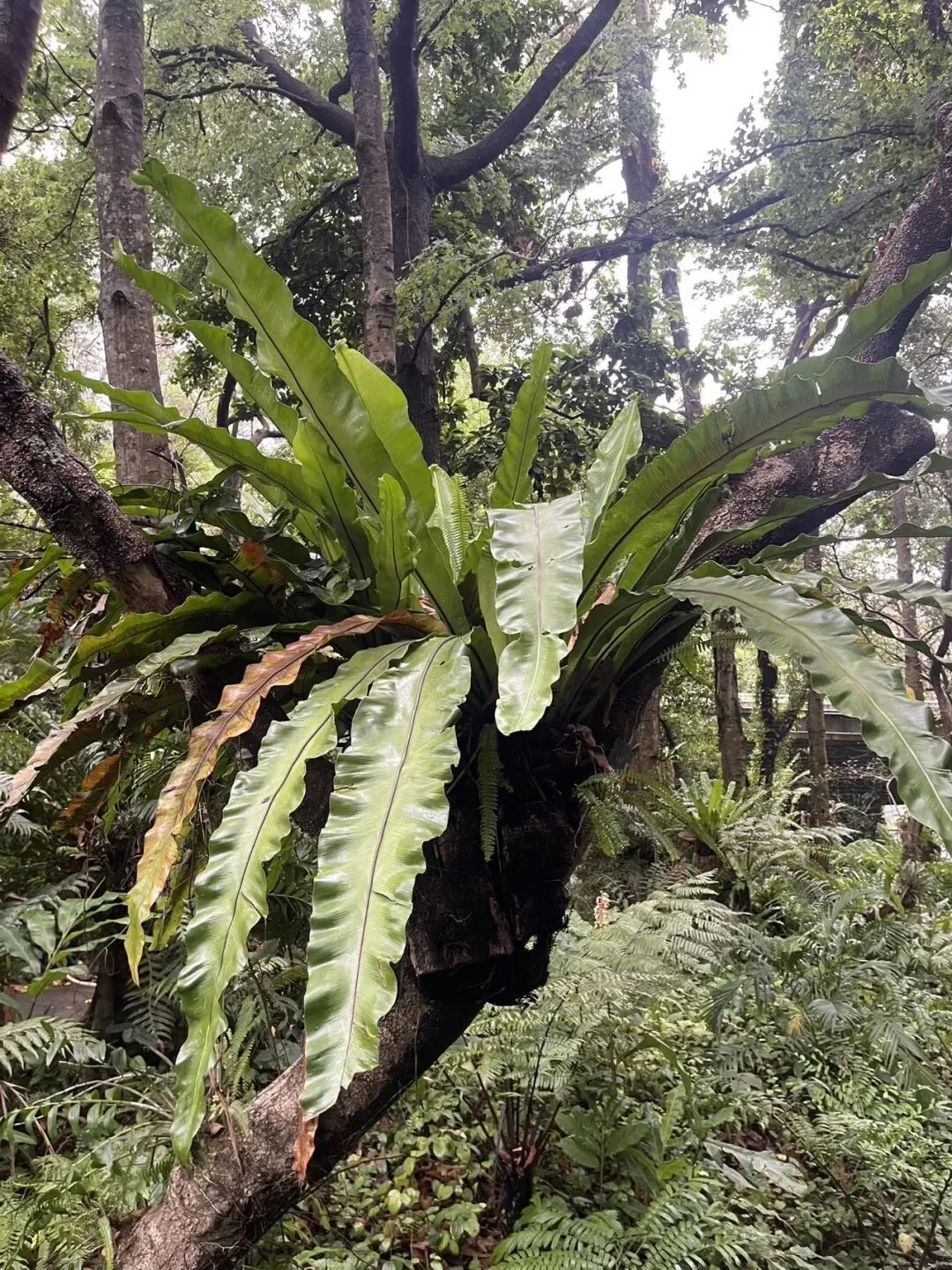 蕨类好阴喜湿,园内水雾喷洒,弥漫在路中,如从凡间入仙境。我沿着栈道漫步,周身被各式蕨类包围,它们长势喜人,枝叶密而不实,给人一种呼吸感,连带着我的脚步都变轻了。我与鸟巢蕨就这么对立着,望着它的每一片长叶,观察它波浪泛起的弧度,想象它生命最开始时的样子。它可能就像一颗雨点落在了这棵树上,渺小到可以忽略不计。鸟巢蕨或许不会预知哪天会有雨露,哪片叶子会枯萎,但鸟巢蕨长成鸟巢蕨之前,已经是鸟巢蕨。