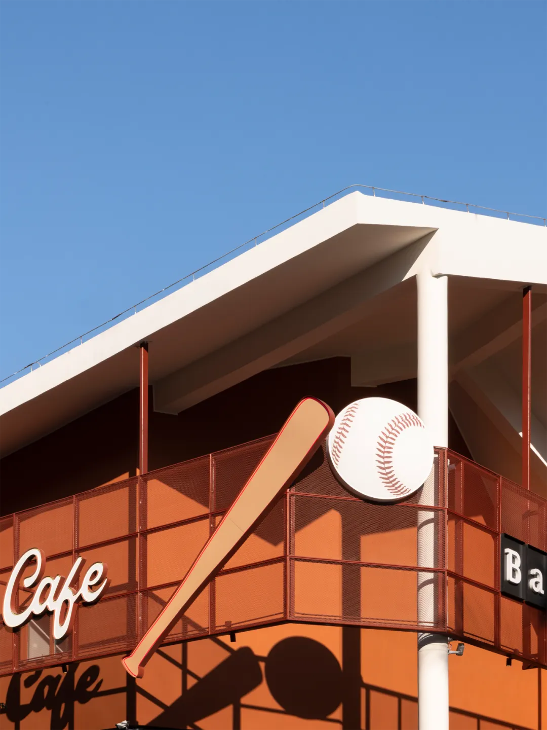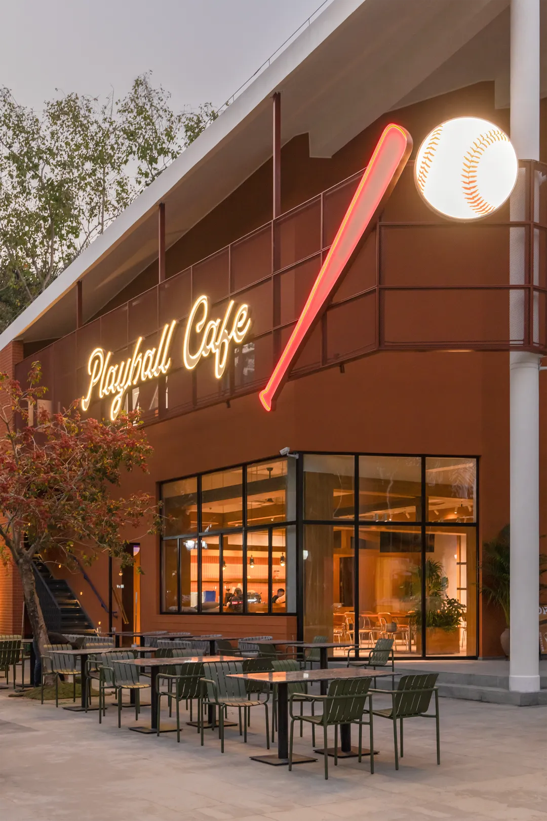 在建筑外观的设计上,球棒和棒球变成巨大霓虹灯装置在外立面形成鲜明的视觉焦点。