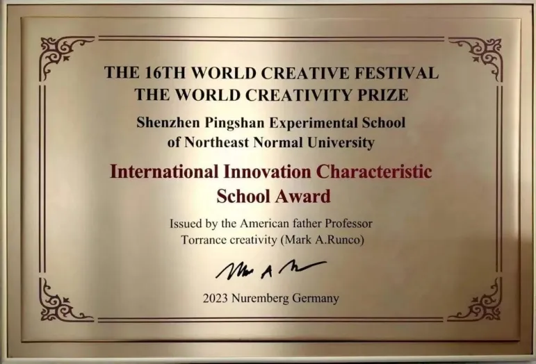 五育并举修六力、因材施教育英才。学校积极探索拔尖创新人才培养的九年一贯制方案,搭建起引导孩子强身心、善学习、做研究、正气质的“英才课程”体系,并与东北师大附中深圳学校共筑“小初高一体化”人才链,构建科学素养与艺体特长的靶向培育系统,让英才潜能的开发挖掘从童年直抵青春:七年级学生团队的科创作品获纽伦堡国际发明展金奖,小学部学子创作的书画作品亮相于于国家级的艺术竞赛。