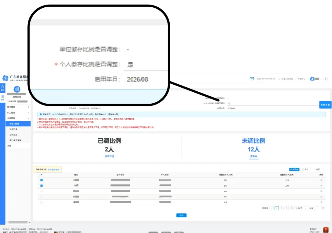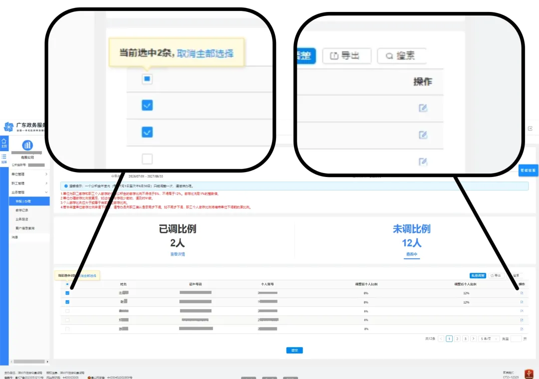 若仅调整个人缴存比例、不调整单位缴存比例,则在【单位比例是否调整】项中选【否】,在【个人比例是否调整】项中选【是】,并编辑需要调整比例的职工信息,确认无误后勾选并点击【提交】。