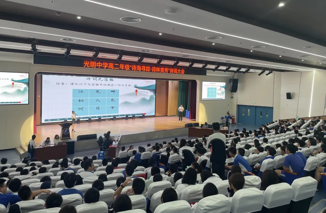 去年10月,光明中学高二年级的诗词大会在学校报告厅拉开帷幕。“诗词接龙”环节,12个班级依次接句,答对后全班齐声朗诵,声音响彻全场;“飞花令”擂台赛上,选手们在倒计时中快速接令,气定神闲。比赛全程,台下600多名学生时而屏息凝神,时而击掌欢呼。