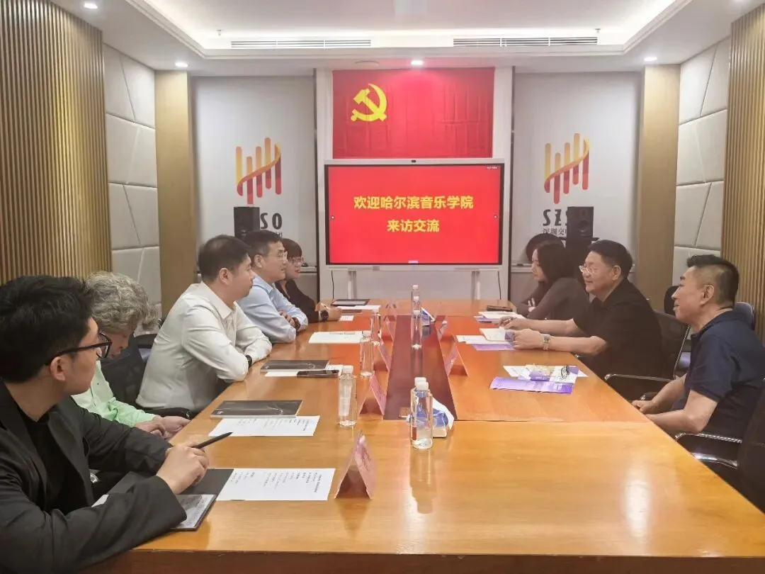 在深圳交响乐团,党委书记林清波热情接待雒文虎一行,详细介绍了乐团的建团历程、艺术创作成果及校企合作实践,表示乐团高度重视与高校的合作,愿意为哈音学生提供实践平台、实习岗位,期待与哈尔滨音乐学院建立常态化合作机制。
