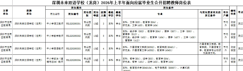 为进一步加强教师队伍建设,深圳未来双语学校(龙岗)拟赴武汉面向2026年应届毕业生公开招聘教师共15名。招聘岗位见《深圳未来双语学校(龙岗)2026年上半年赴武汉面向2026年应届毕业生公开招聘教师岗位表》(附件1,以下简称《岗位表》)。