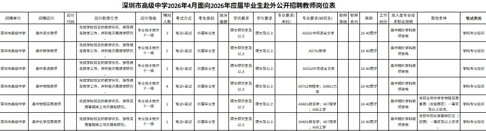 1.深圳市高级中学2026年4月面向2026年应届毕业生赴外公开招聘教师岗位表