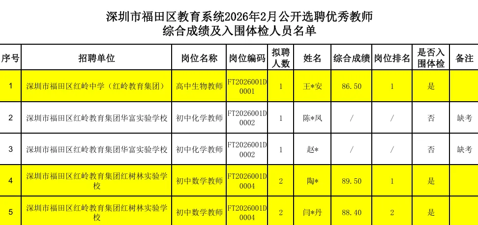 深圳市福田区教育系统2026年2月公开选聘优秀教师考核工作已结束,现将综合成绩和体检有关事项公告如下: