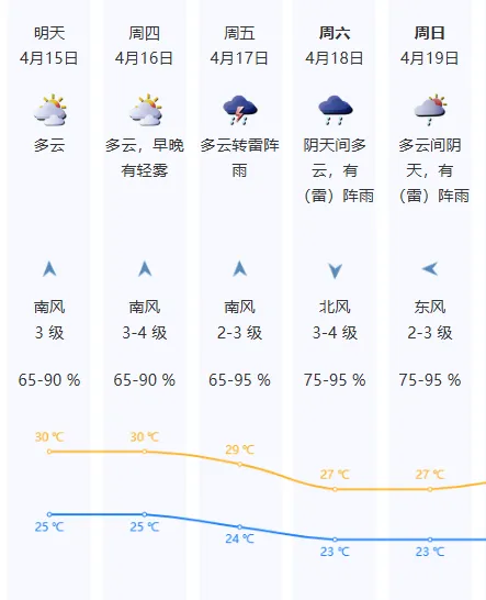 15日-16日,多云为主,早晚有轻雾,午间较热,15日气温25℃~30℃;