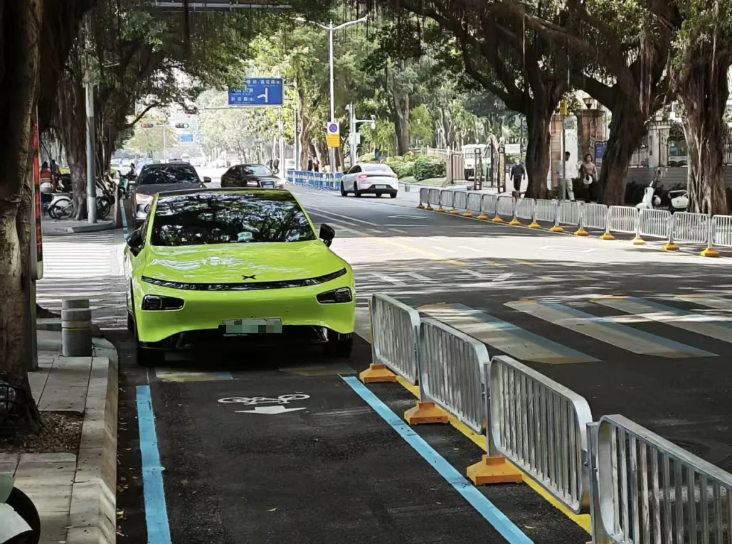 ▲机动车违停非机动车道出入口,阻碍非机动车通行。