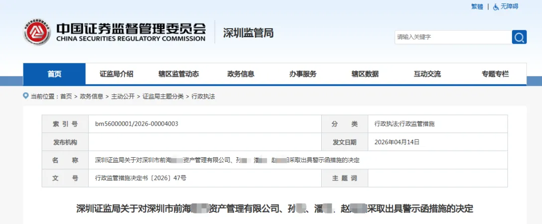 2026年4月14日,深圳证监局对深圳市前海J*资产管理有限公司、孙*、潘*、赵*采取出具警示函!