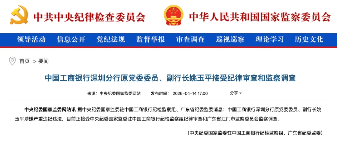 中央纪委国家监委通报,据中央纪委国家监委驻中国工商银行纪检监察组、广东省纪委监委消息,中国工商银行深圳分行原党委委员、副行长姚玉平涉嫌严重违纪违法,目前正接受中央纪委国家监委驻中国工商银行纪检监察组纪律审查和广东省江门市监察委员会监察调查。