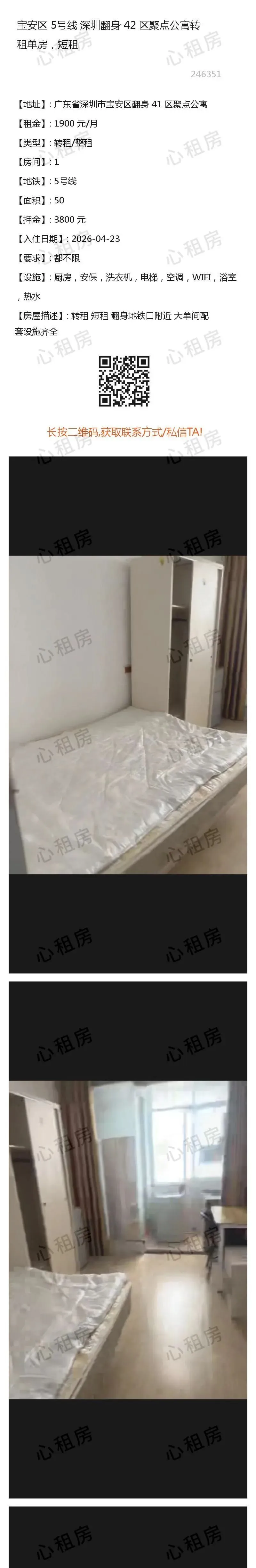 深圳租房>> 宝安区5号线深圳翻身 42 区聚点公寓转租单房,短租1900元/月