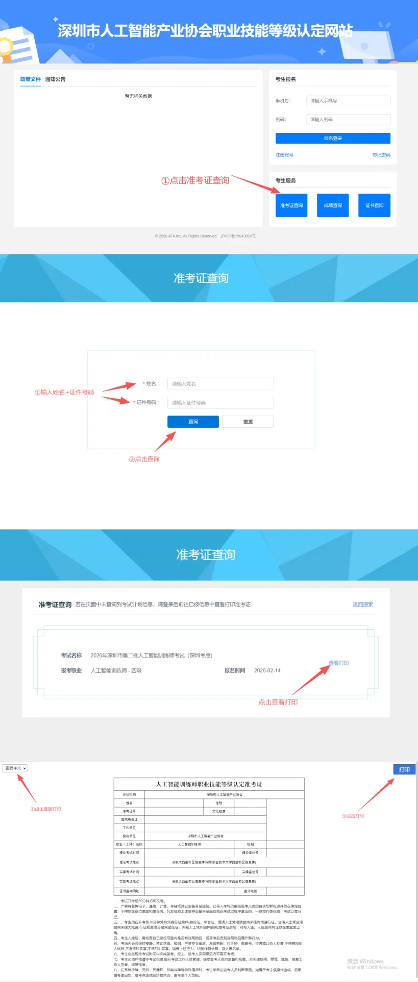 自4月14日9:00起,考生可登录深圳市人工智能产业协会职业技能等级认定网站自行下载并打印准考证。操作路径:登录准考证下载网址→输入姓名+身份证号→点击查询→查看打印→选择“竖版样式”→A4打印下载准考证,具体下载流程参见附件1准考证下载指引。