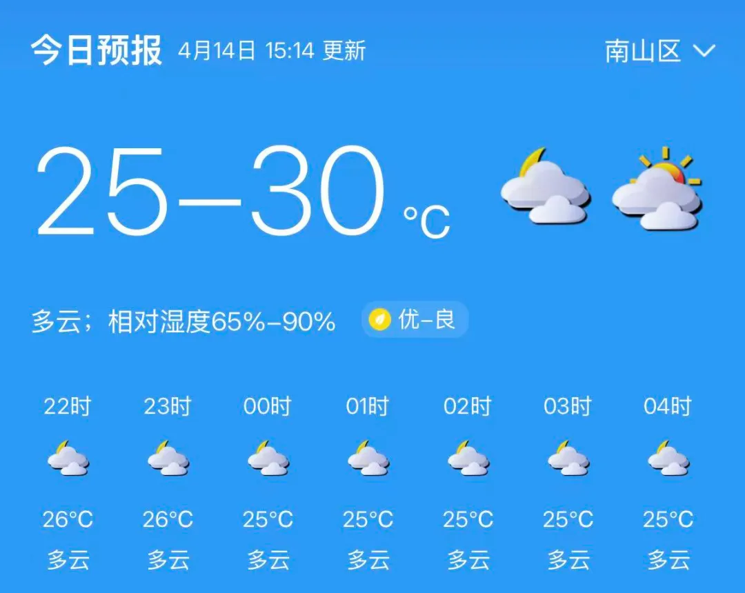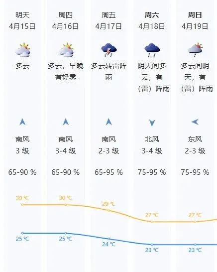 15日-16日,预计深圳多云为主,早晚有轻雾,午间较热,15日气温25℃-30℃。