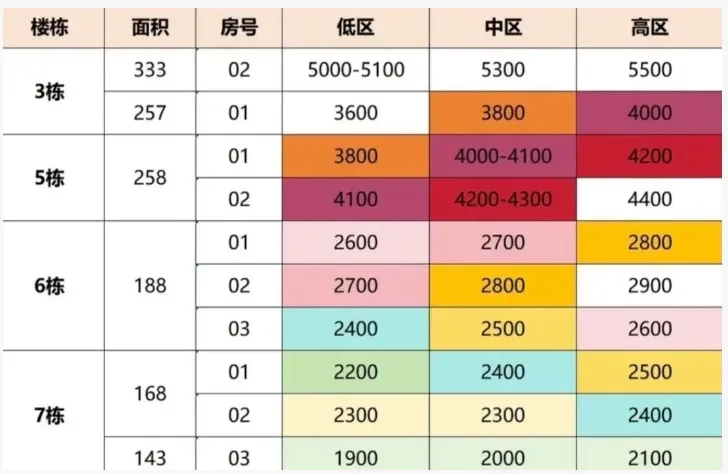 其中,143㎡户型总价约1900万~2100万,168㎡户型总价区间在2200~2500万,188㎡户型总价区间在2400~2900万,而258~333㎡的大户型,总价门槛直接跃升至3600万以上,高区可达5500万。