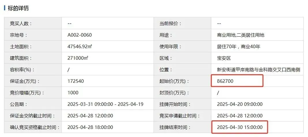 该项目地块为宝中A002-0108宗地,原为宝中近五年首次挂牌的黄金商住靓地。2025年8月15日,经过187轮激烈竞价,招商+华润联合体以总价86.4亿元成功竞得,溢价率约34.81%,楼面地价高达59586元/㎡,刷新了宝中片区土地成交纪录,同时也创下2025年深圳涉宅用地总价新高。