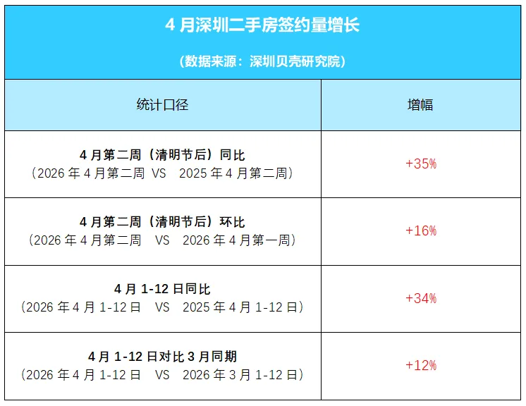 据乐有家研究中心数据,2026年3月深圳一二手住宅总网签量7898套,环比上涨117%,创下近11个月最高值。进入4月,热度仍在延续——据深圳贝壳研究院监测,4月前12天二手房签约量同比增长34%,较3月同期增长12%。