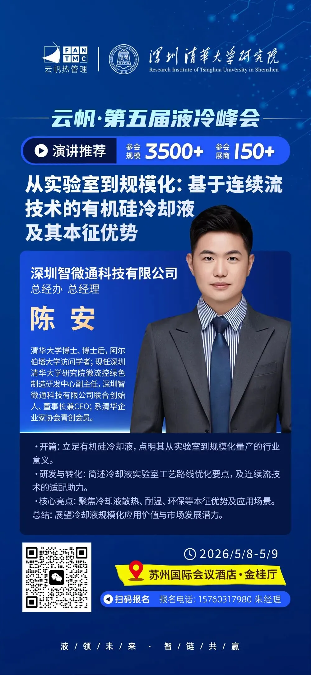 深圳清华大学/深圳智微通科技有限公司-总经理-陈安将出席本届活动,并发表重要主题演讲"从实验室到规模化:基于连续流技术的有机硅冷却液及其本征优势",诚邀聆听,共话未来!
