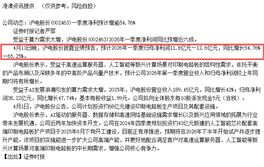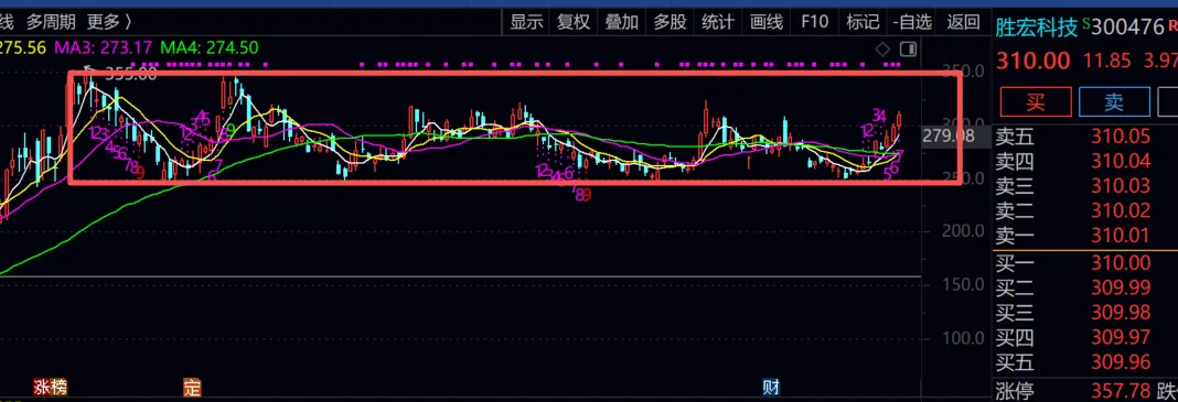 今天市场继续向上,六大指数均收红,深证成指创出新高来,这说明了目前市场正在走上升阶段,而非下跌,之前的浪型判断需要重新划分。这里应该继续看多做多。今天盘中加仓2成仓位,买了中韩半导体和小部分特变电工。位于前排的股票:存储、PCB和CPO都连续大涨了,佰维存储、江波龙、德明利又创新高了,目前已经找不到舒服的买点,在恐慌低点时,没有买到足够多的筹码,有点遗憾。现在加仓只能分开买一部分前排股票,一部分二排股票。市场一般会呈现这样的规律:先普涨-->分化-->轮动。不知道啥时候光存算涨完,啥时候能轮到二排股票。这里是高位,低位不买,高位两难。跟美伊战争前的道理一样,高位不减,低位两难。如果这里追高买入,由于持仓成本高,抗风险的能力就差,如果受到外围市场和环境的影响,股市震荡调整,稍一波动,就会导致拿不住股票。心里压力一大,就会恐慌卖出股票。追高买入,将为调整杀跌埋下伏笔。追涨容易吃套。如果是从底部买入,一路持股上来的,既可以现在逢高减仓一半,另一半等右侧信号出现再清;也可以抗过波动等右侧。无论如何,都非常主动灵活。加速的可以减仓一半,另一半让子弹再飞一会。今天沪电股份出一季报业绩预告了,早盘就快速涨停了,业绩实在太好了,受到这消息影响,胜宏科技和深南电路也跟着大涨,PCB的涨势根本停不下来。沪电已经创出历史新高了,高景气度的股票恒者恒强。深南电路还差一点就新高了,继续拿着等新高。4月份是出一季报的密集期,预计胜宏科技和深南电路的业绩非常好,估计涨势到业绩公布时,等利好消息兑现后,就该调整了。这个位置买入有点难办,不买又怕继续涨,买吧又担心追高调整,容易吃套。要不要买点胜宏,试试水?股价一直在区间里震荡,已经持续了7个月了。公众号仅作为我日常操作记录用,将自己交易的过程和点点滴滴的心得记录下来,为的是更好更快地成长,请理性看待,切勿跟风。个人观点,仅供参考,据此交易,后果自负!