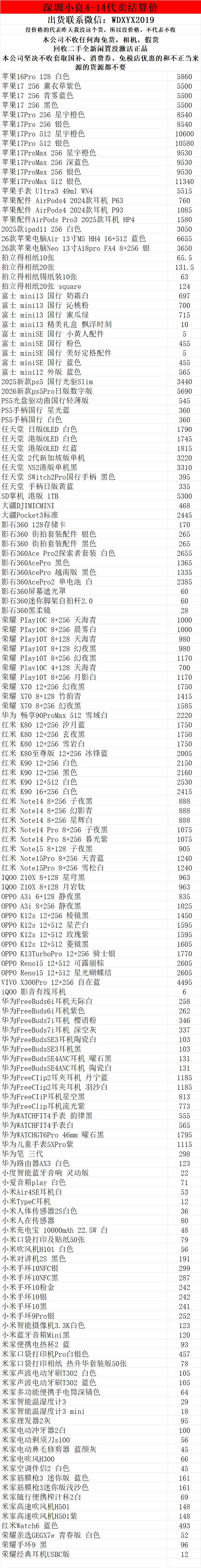 >深圳小良2026.4.14电子产品代卖结算价(美妆价格小程序查看)