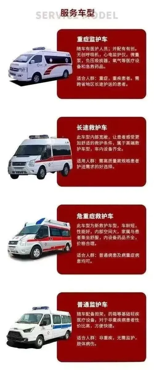 在车辆配置上,长途转运专用救护车均经过专业改装,配备高性能减震系统与恒温空调,最大限度减少路途颠簸对患者的影响,避免加重病情。车内搭载全套重症监护医疗设备,包括多参数心电监护仪、无创/有创呼吸机、吸痰器、供氧系统、除颤仪、急救药品箱等,堪比移动ICU,全程实时监测患者心率、血压、血氧等生命体征,突发病情变化可第一时间开展紧急救治,保障转运途中医疗安全。