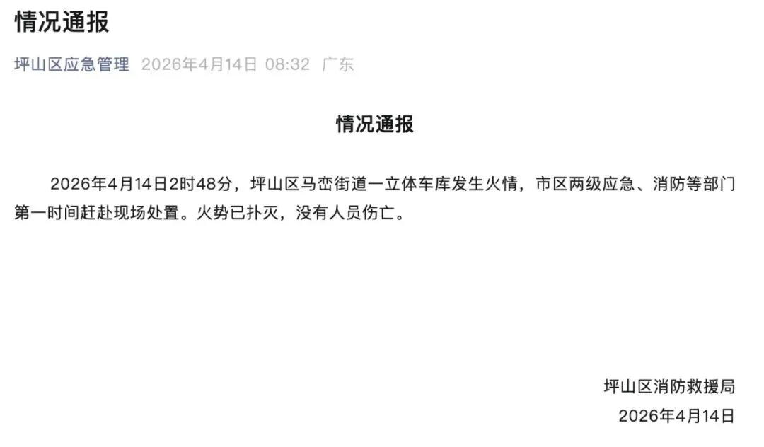 深圳坪山区比亚迪工厂,4月14日凌晨发生了火情,马峦街道一立体车库现场浓烟滚滚。