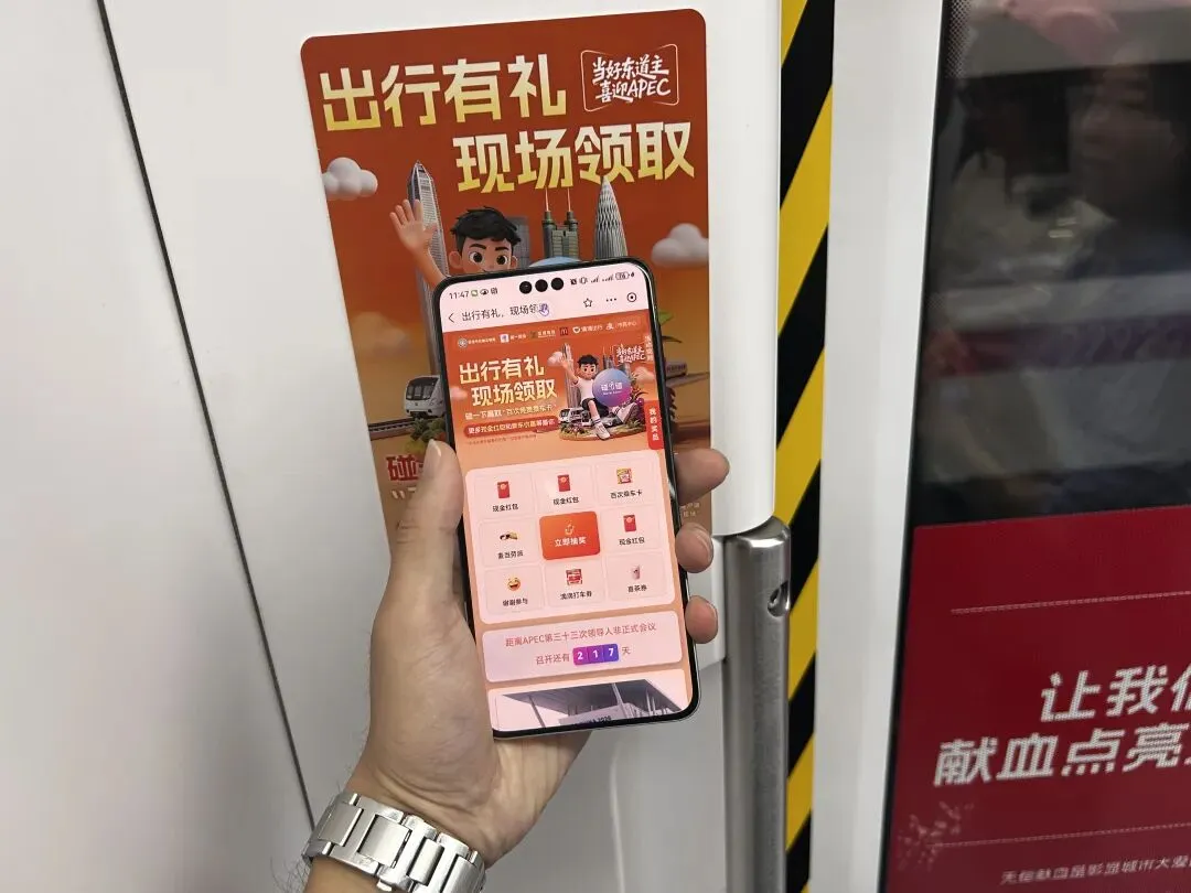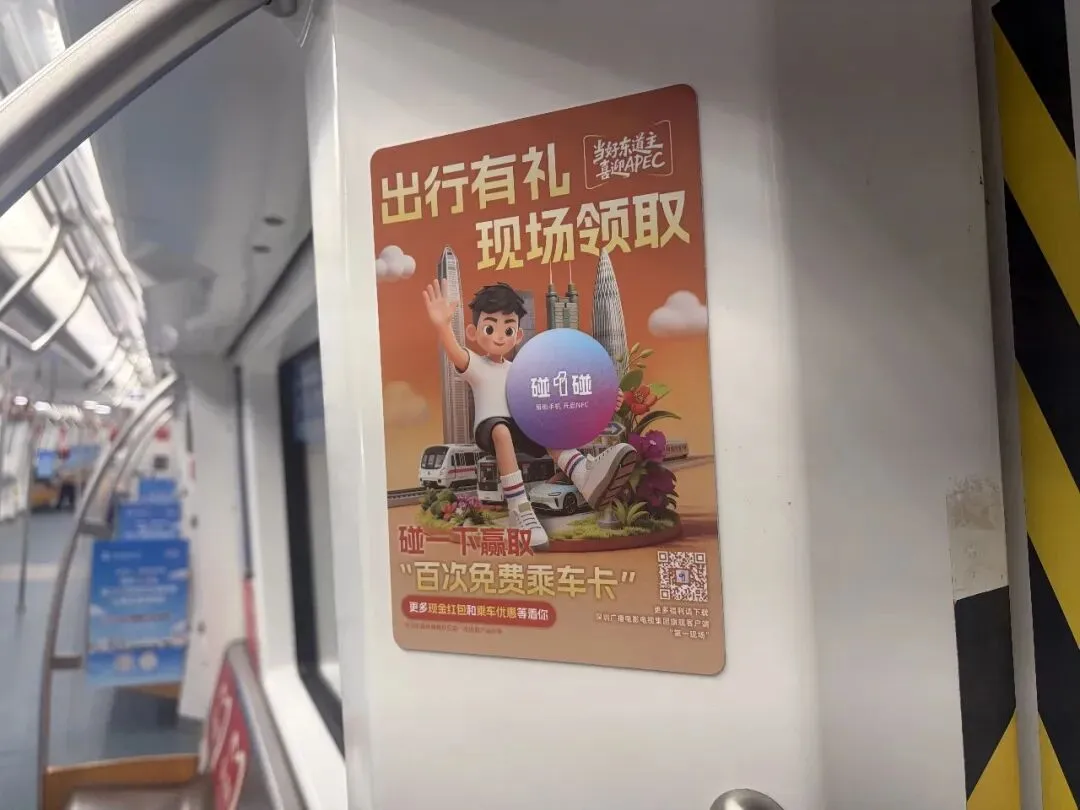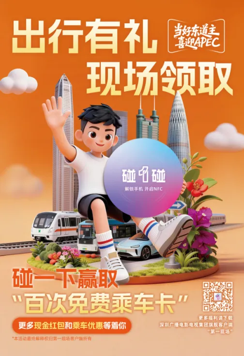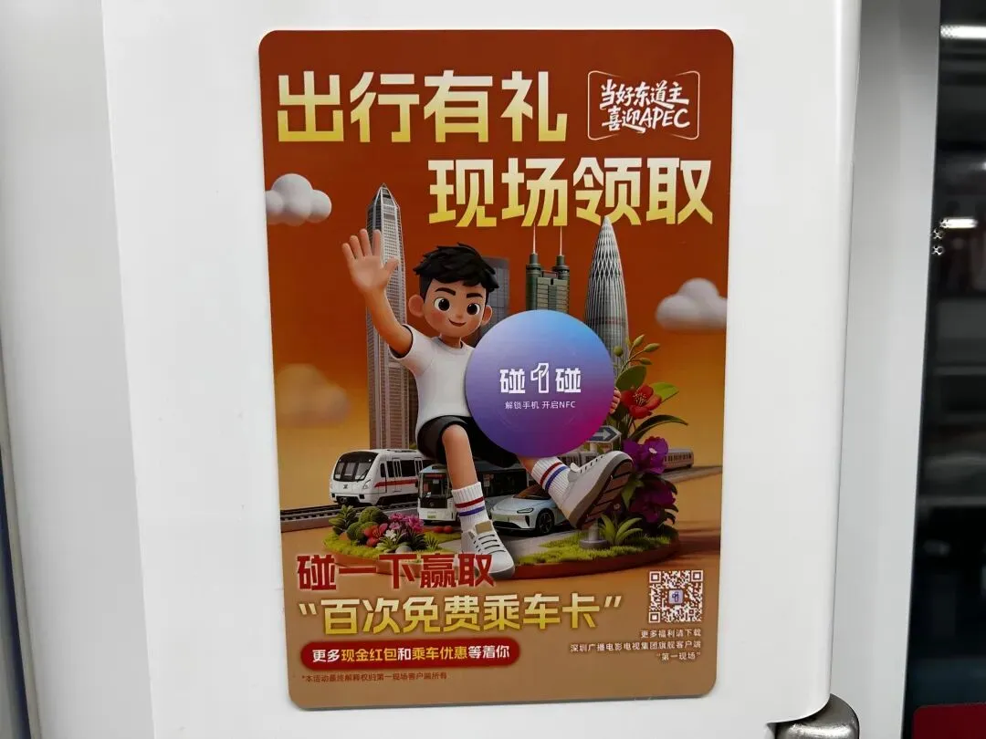 乘客开启手机NFC功能,在深圳地铁2号线车厢内指定区域轻轻“碰一碰”,即可快速参与抽奖,领取绿色出行优惠福利;同时,还可一键跳转第一现场APP【APEC·深圳】综合服务频道,实时掌握APEC会议动态与城市资讯。