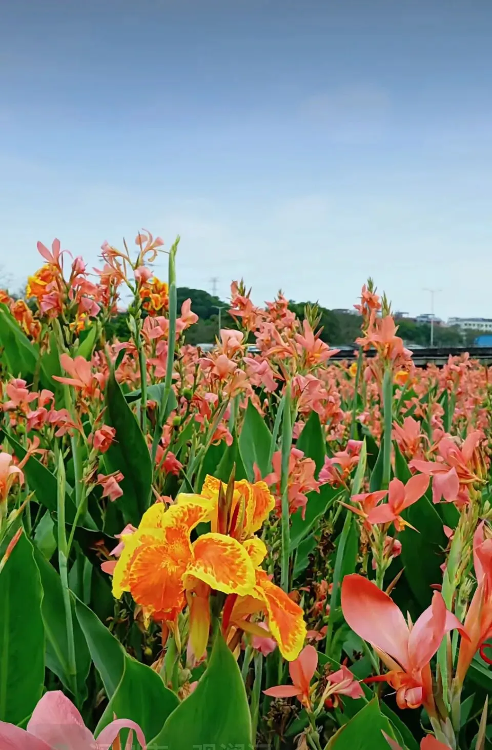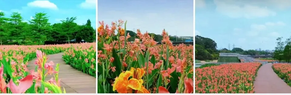 美人蕉肆意盛放,粉的娇艳、橙黄的明媚,层层叠叠的花穗在微风里轻轻摇曳,像打翻了春日的调色盘。