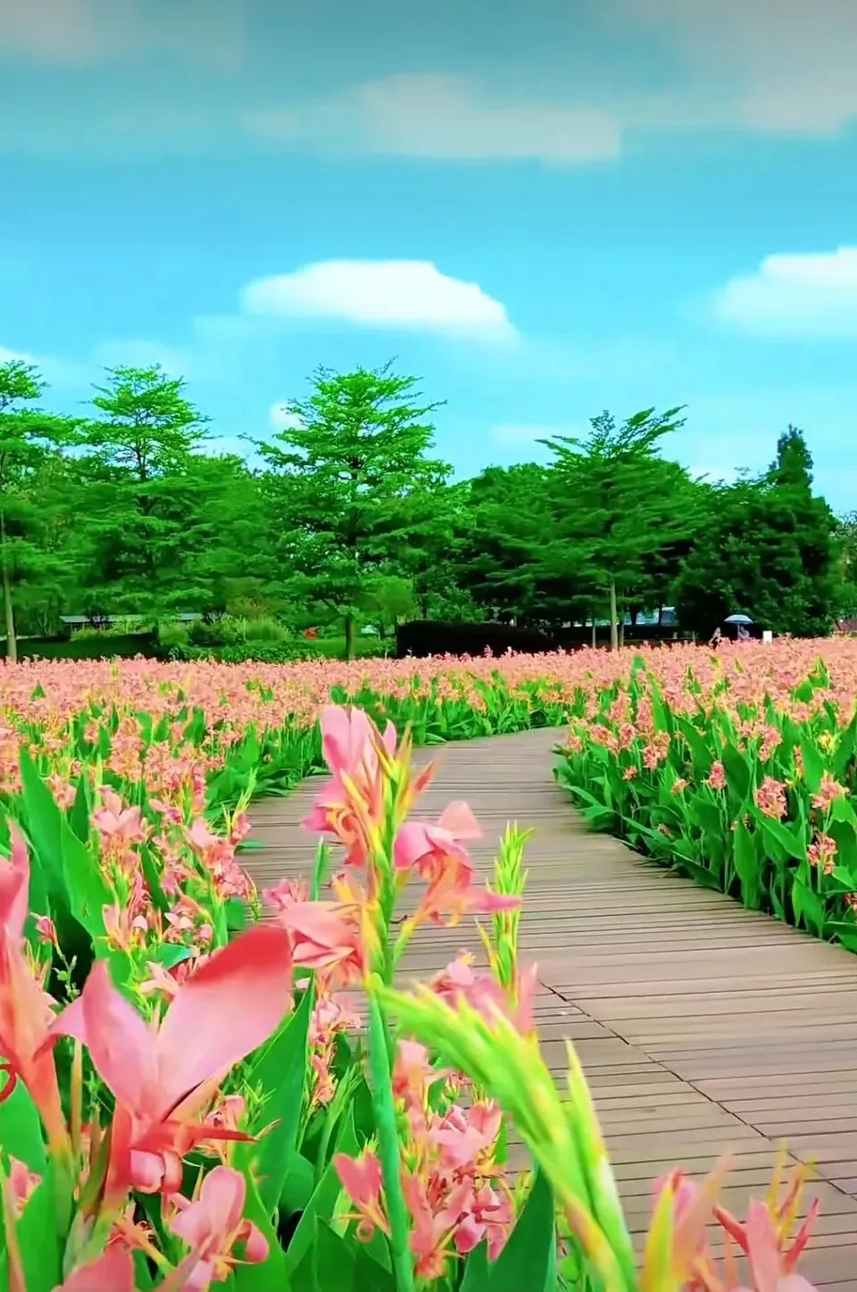 木质栈道蜿蜒穿梭在花海间,脚下是木板的轻响,身旁是花朵的芬芳,