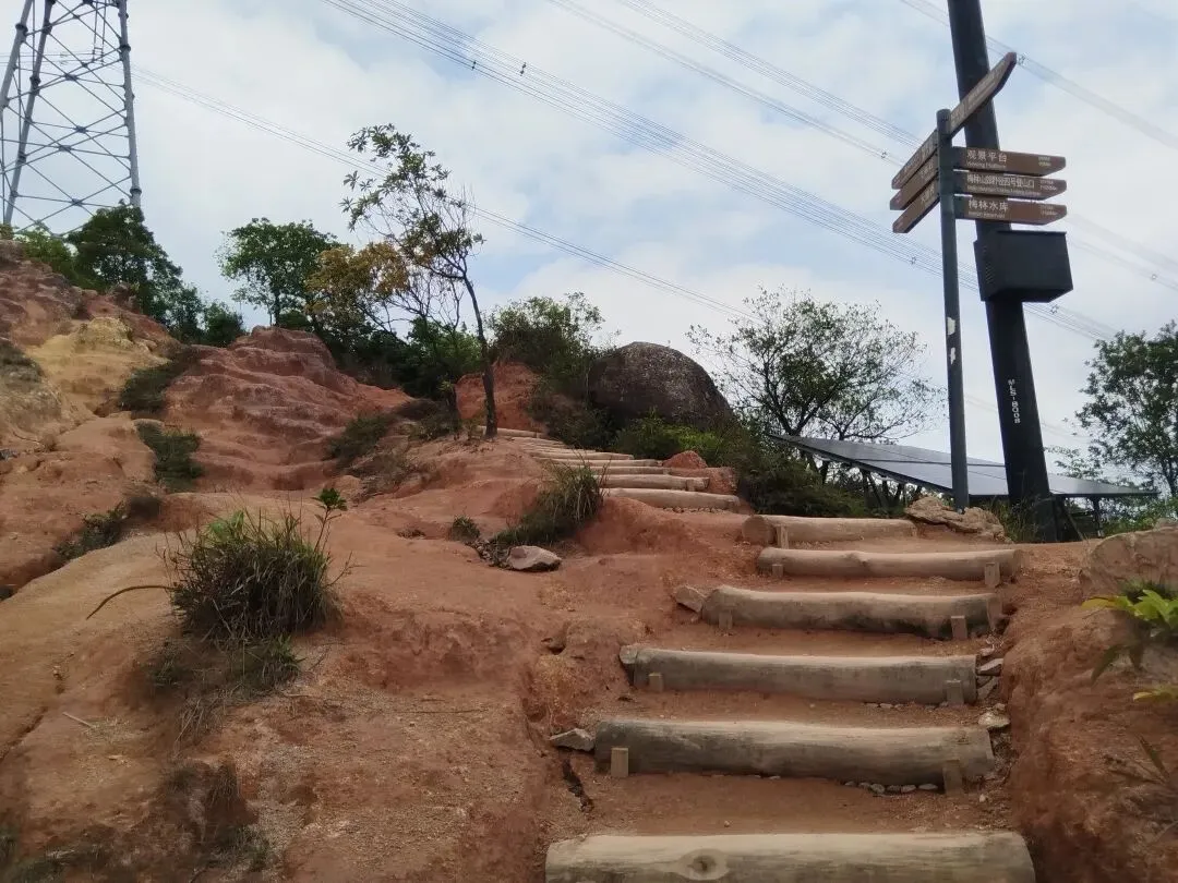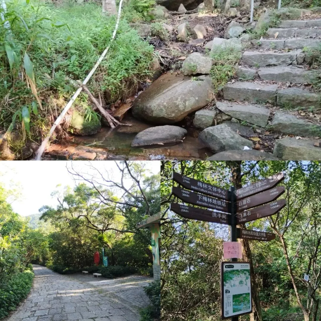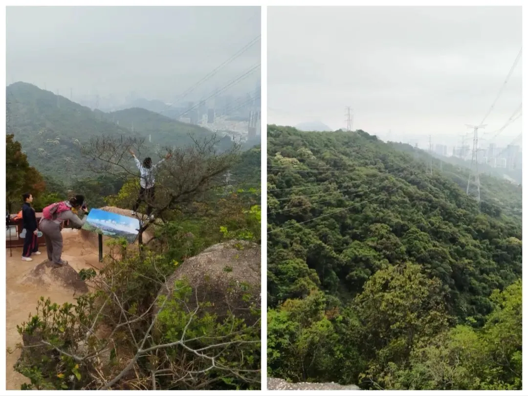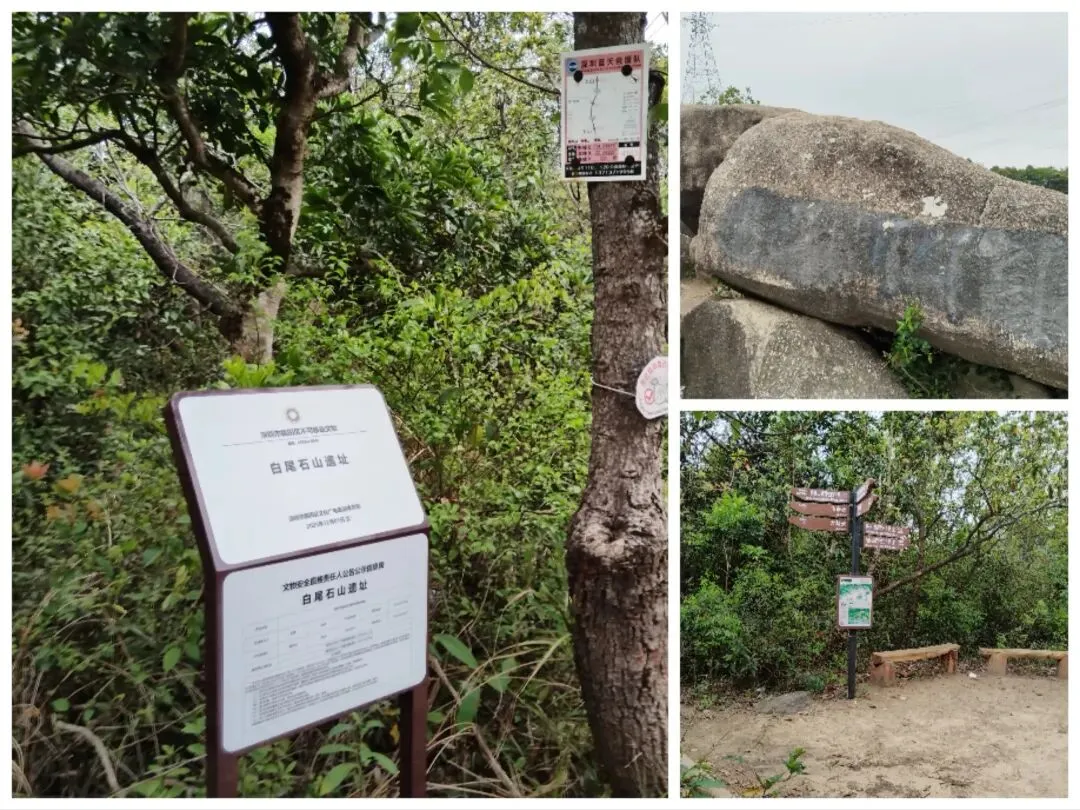 在梅林绿道的几个登山口,也都标注有“白眉石”的指向,可是真的辛辛苦苦行至最高处,以为可以一睹“白眉石”真容时,却发现无论自己如何想象,也都找不到“白眉石”的一丝影子。好在那里视野开阔,已被号称为“城市中轴观景台”,城区高楼与自然山体交相辉映,即使不见白眉石,也仍是可以让人颇有几分心旷神怡的舒爽。如果还想一探究竟,那么留意一下从“虚静石”(现在已被称为鹏城远眺石)下往梅林水库途中山腰岔口处,那里有块标有“白尾石山遗址”的醒目白牌,也许可以证实附近确实存在过一块被称为“白眉石”(所谓的“白尾石”很可能就是它的谐音)的醒目石头。至于它的确切位置和具体形状,迄今为止都未能搜索到有准确文字记录之类的“铁证”。每次徒步鲲8路过这一带时,总会有“不见铁证”的困惑,可是在高处拍了几张照片之后,这困惑每次却也都是“转瞬即逝”,因为我们都急着要赶往前方不远处的“飞来石”歇歇脚。近日整理手机相册时,重温“白眉石”一带的景色和疑问之余,觉得自己至少可以对其进行一些的推测。白眉石的位置,原先大概就是位于眼前高压电塔所占用的区域;石头本身某个侧面也许真的是“其状如眉”,石面上应该还可能有微弯的条状“白色石英”,早前因此被形象地称为了“白眉石”。后来这块白眉石估计在高压电塔施工时,因碍事而被毁,导致如今了无踪迹、徒有其名。