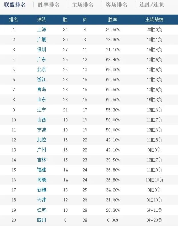 其实榜首的位置早就没悬念了,上海拿着 34 胜 4 负的战绩,一波 19 连胜直接提前锁定常规赛冠军,广厦 30 胜 8 负稳坐第二,争冠无望、掉出前二的概率也几乎为零。问题就在于 3 到 5 名的乱战,深圳领先广东 1 个胜场,广东又领先北京 1 个胜场,最后 4 轮谁都有可能掉链子,排名指不定还要怎么变。