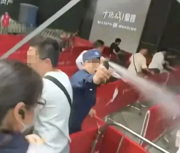 因有人插队引发争执,一名保安突然拿出辣椒水,朝密集人群持续喷洒 。