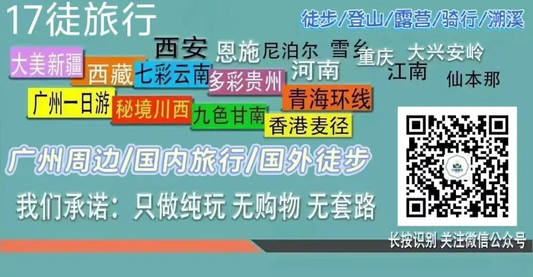 注意:遵规守时是户外良好作风,提早五至十分钟利己又利人;活动行程仅为根据以往活动时间预计,当天的交通状况及队伍的行进速度快慢会造成实际时间上有出入;如果在活动中遇到不可抗力的突发情况,领队有权在不影响活动体验的原则下,根据实际情况调整行程,请大家理解配合。