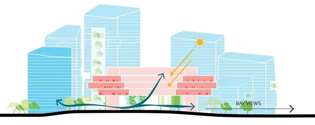 项目突破传统办公空间模式,构建“围合式办公+立体公共空间”体系。中部与北端云楼设开放式景观中庭,通过自然通风与遮阳设计降低能耗;云客厅被核心筒抬升至空中,最大化观海视野。