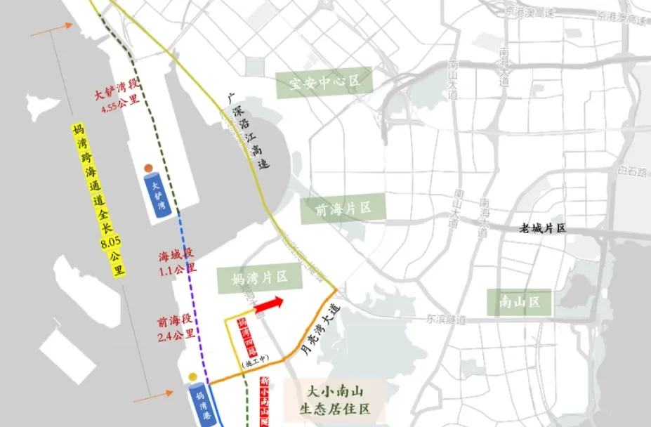三座云楼竣工,经二路(纬一路至纬六路)隧道主体结构贯通,全长746.52米,双向四车道,限速40公里/小时。该通道连接前海与大铲湾,缓解周边交通压力。妈湾跨海通道(全长8.1公里)已双向贯通,地铁15号线(深圳首条环形地铁)设站企鹅岛,形成“海陆空”立体交通网。