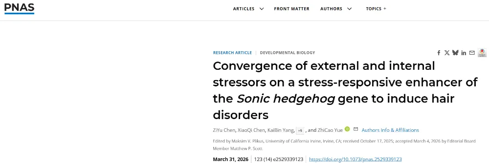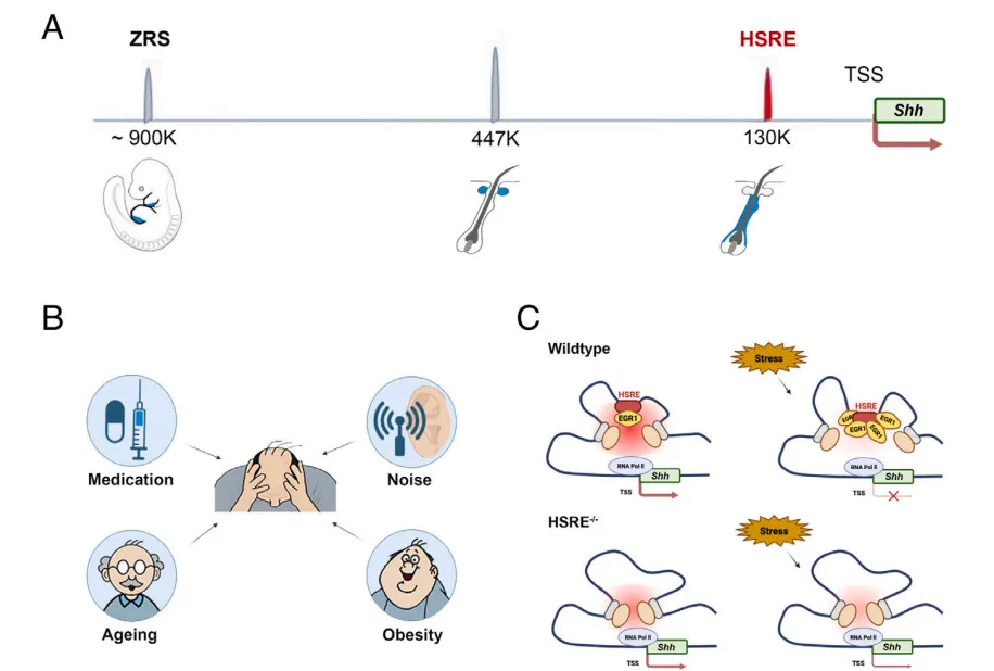 哺乳动物持续暴露于多种内源性与外源性应激源。尽管毛囊(HFs)对应激极为敏感,但应激诱导的反应如何与毛囊生长、周期及再生的内在调控因子相关联,目前尚不明确。2026年3月31日,深圳大学乐志操独立通讯在PNAS 在线发表题为“Convergence of external and internal stressors on a stress-responsive enhancer of the Sonic hedgehog gene to induce hair disorders”的研究论文。该研究对编码毛囊关键有丝分裂原的Sonic hedgehog(Shh)基因的远端增强子进行了表征,并鉴定出一个毛囊应激响应增强子(HSRE),作为多种内外应激信号汇聚的共同靶点。该增强子与即刻早期基因早期生长反应蛋白1(Egr1)共同作用,介导了多种应激条件下毛发生长停滞与再生障碍,包括化学治疗诱导的脱发、噪音诱导的毛囊营养不良,以及衰老与肥胖状态下的毛发再生延迟。在应激条件下,Egr1表达上调抑制Shh基因表达;然而,当HSRE缺失时,这种抑制作用并不发生。此外,两种抑制Egr1表达的化学试剂SR11302与T-5224均能在不同应激条件下挽救上述毛发异常。作者提出,Egr1–Shh轴整合了不同的应激信号,并通过抑制Shh基因表达诱导毛发异常,从而为治疗干预提供了可行的策略。本研究建立了一个范例,阐明应激如何通过调控关键的内在形态发生因子来扰乱器官生长与再生。毛发营养不良与脱发常与日常生活中压力增加相关。毛囊(HFs)具有高度增殖性、代谢需求旺盛、血供丰富且神经支配密集,因此对各种应激源敏感并不令人意外。促进脱发的应激可能来源于明确的外部刺激,如化学治疗药物与环境噪声,或源于衰老与肥胖过程中的内部代谢/表观遗传变化。已提出的机制涉及调控性细胞凋亡、神经-内分泌-炎症反应、干细胞维持不足以及局部炎症反应。目前尚不清楚是否存在一个共同的分子整合系统,使得这些不同的应激源能够汇聚于此并引发协调性反应。数十年的深入研究已证实,毛发的发育、生长与再生受一小群进化保守的信号通路调控,例如Wnt(Wingless-related integration site)、骨形态发生蛋白(BMP)、成纤维细胞生长因子(FGF)、Sonic hedgehog(SHH)以及NOTCH信号通路。一个合理的假设是,应激干扰了这些关键内源性信号通路之一,从而导致毛发疾病。事实上,作者发现SHH信号在化学治疗下特异性受到干扰,进而引起毛囊内的损伤反应。然而,SHH信号在其他应激条件下是否也会发生扰动,以及应激如何与Shh基因表达的调控相关联,目前仍属未知。SHH信号对毛发发育至关重要。SHH也是毛囊内主要的有丝分裂原,并调控毛囊周期。Shh基因的调控是远程增强子功能的典型范例。尽管在胚胎发育过程中,特异性调控肢体芽、神经管及其他组织器官中Shh基因表达的增强子已被鉴定,但调控毛囊中Shh基因表达的增强子尚未得到表征。在作者先前以结直肠癌细胞为模型的研究中,作者发现SHH基因本身并非即刻早期基因(IEG),而是被IEG早期生长反应蛋白1(EGR1)快速抑制,后者通过一个位于转录起始位点(TSS)上游139 Kb处的化疗响应性增强子发挥作用。本研究始于在小鼠中定位可能调控毛囊内Shh基因表达的潜在增强子。作者假设,各种外部与内部应激源通过汇聚于Shh基因表达的调控来诱导毛囊损伤。该研究结果表明,一条Egr1–Shh轴整合了截然不同的化学性、噪声性、衰老相关及肥胖相关的组织应激源,从而影响毛发的生长与再生。https://doi.org/10.1073/pnas.2529339123iMedicines,专注于生物医学科研报道。