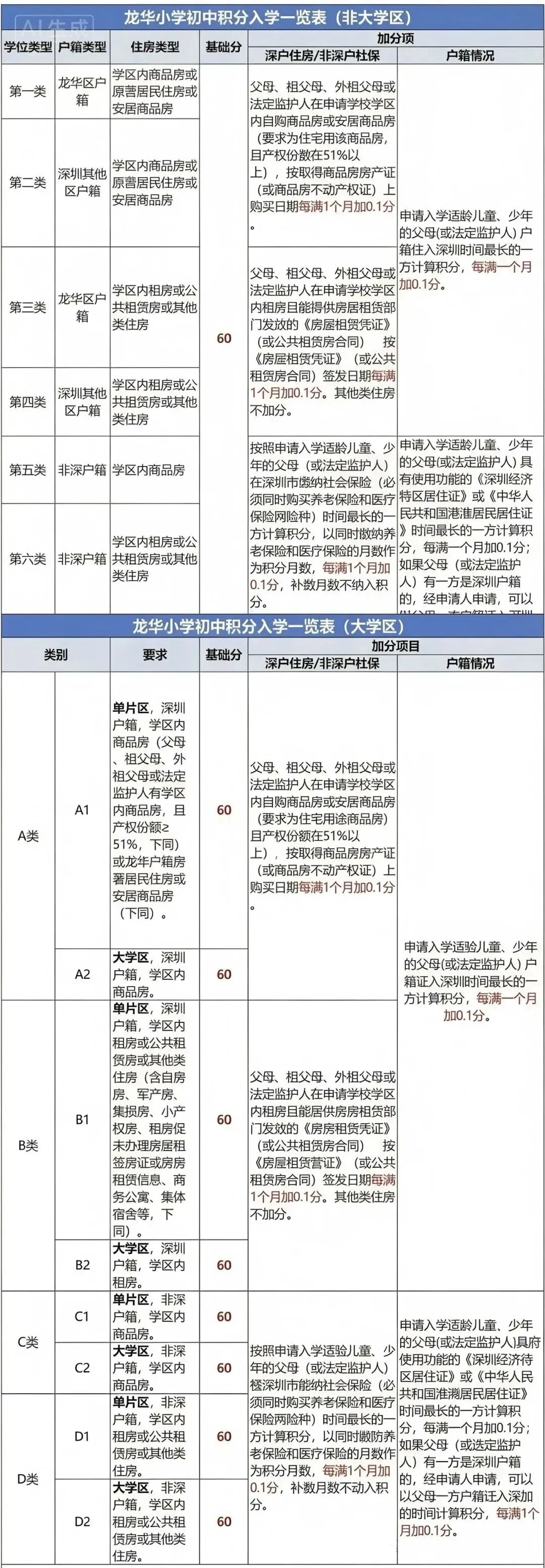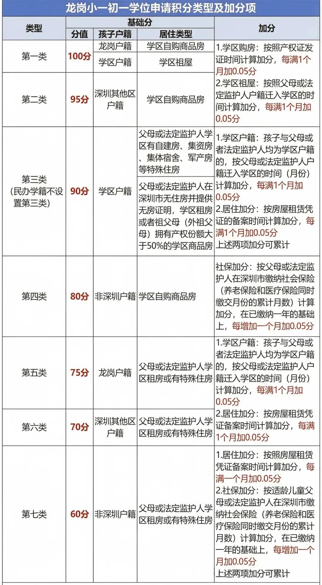 · 一类(龙岗户籍 + 学区房)100 分基础分,六类(非深户租房)60 分,档次分差大