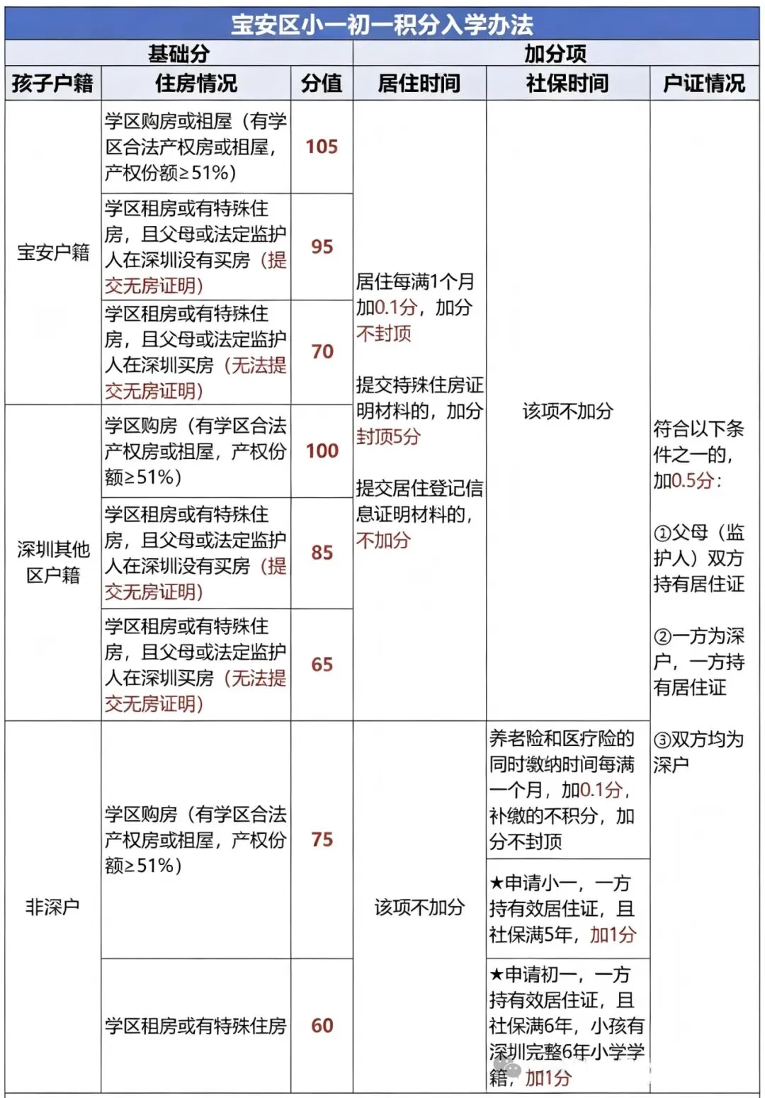 ·宝安户籍 + 学区房直接 105 分基础分,比非深户租房高 45 分,深户买房直接赢大半